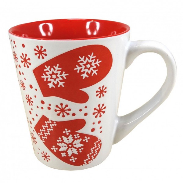 Très beau Mug Blanc en céramique, motifs Flocons, intérieur Rouge.