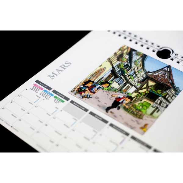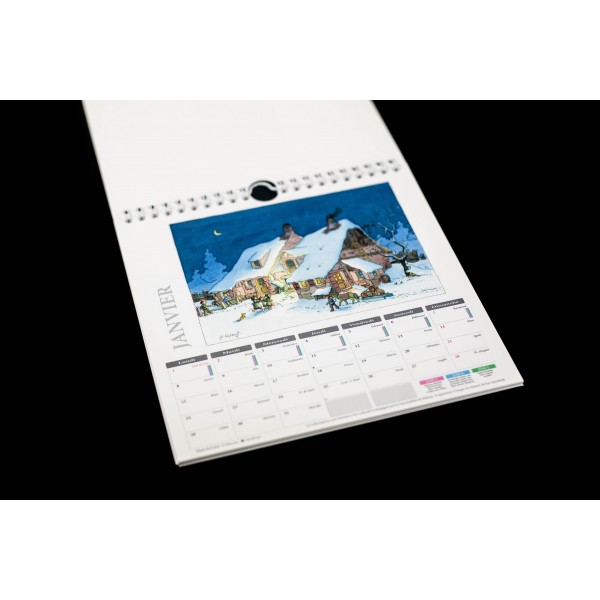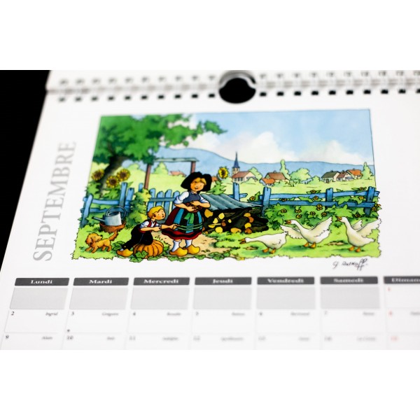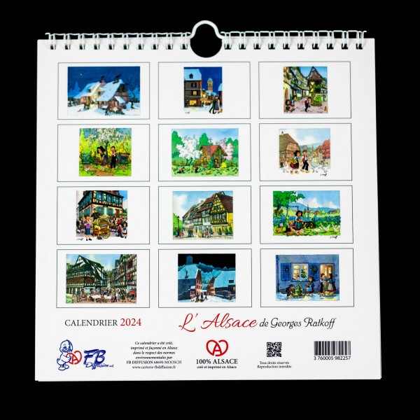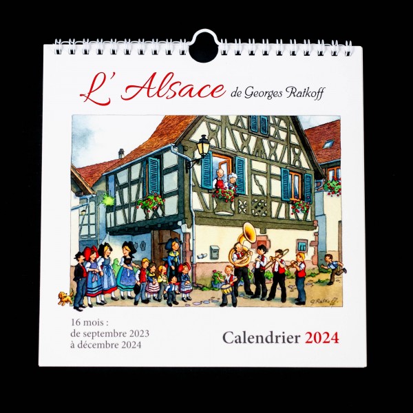 - Calendrier à suspendre (relié par spirales) entièrement illustré par des dessins de Georges Ratkoff sur le thème de l'Alsace.
