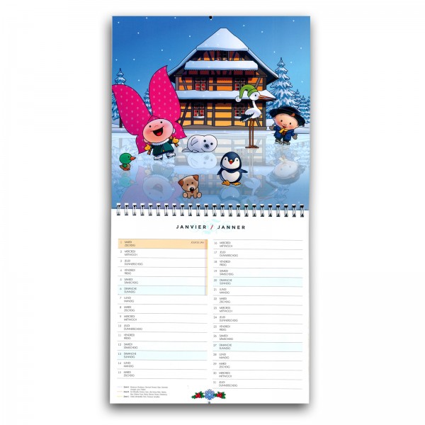 Les jours et mois sont imprimés en français et également traduits en dialecte alsacien.