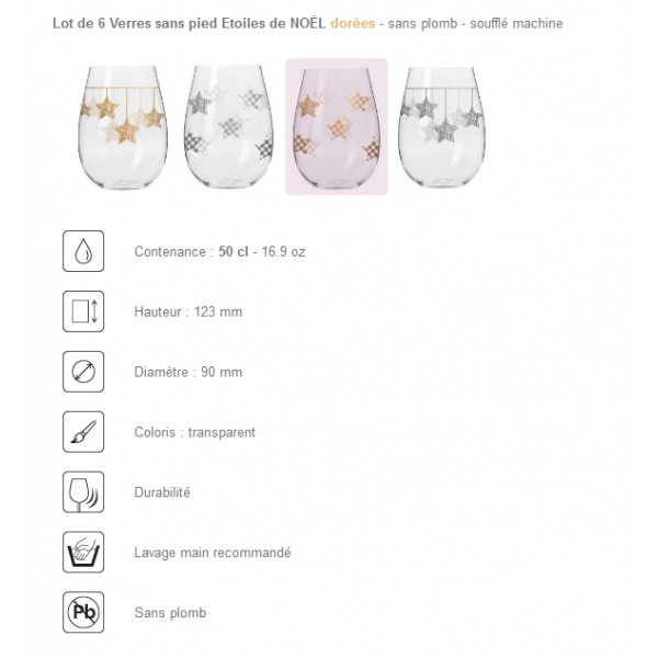 Lot de 6 Verres sans pied Etoiles de NOËL dorées - sans plomb - soufflé machine