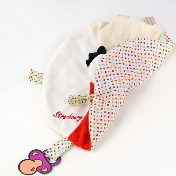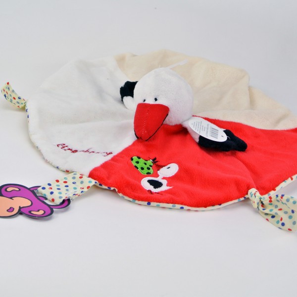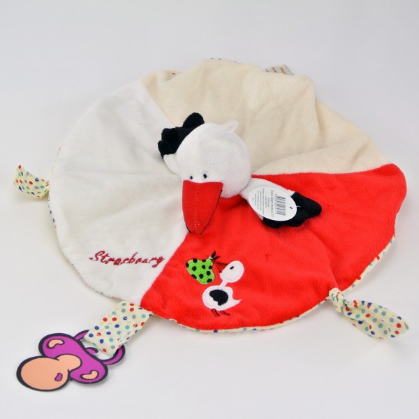Doudou plat Cigogne, avec marquage brodé "Strasbourg", dans un tissu très doux, avec motifs brodés, ainsi qu'une attache pour la tétine.