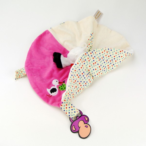 Doudou plat Cigogne, avec marquage brodé "Strasbourg", dans un tissu très doux, avec motifs brodés, ainsi qu'une attache pour la tétine.