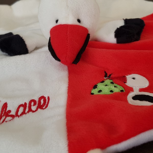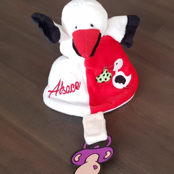 Doudou plat Cigogne, avec marquage brodé "Alsace", dans un tissu très doux, avec motifs brodés, ainsi qu'une attache pour la tétine.