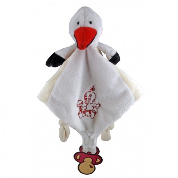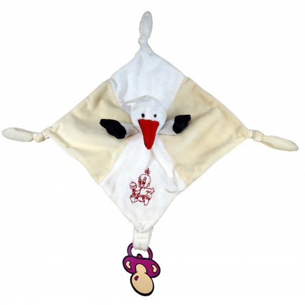 Doudou cigogne dans un tissu très doux, avec 3 nœuds que bébé pourra mordiller lorsqu’il fait les dents, ainsi qu’une attache pour la tétine.