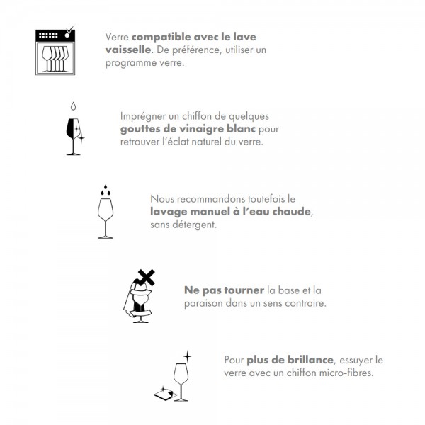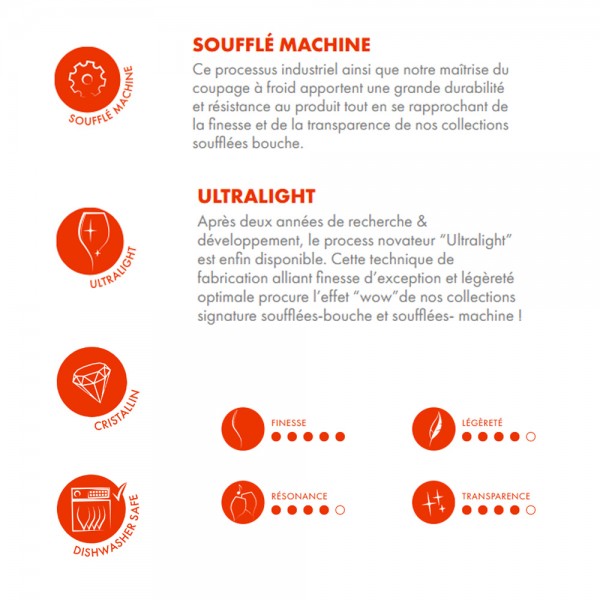 A noter que certaines pièces peuvent éventuellement présenter des petites bulles visibles au niveau du pied, de la tige ou du buvant, aussi bien sur les verres soufflés bouche et les verres soufflés machine. Ceci est tout à fait normal et ne peut être évité totalement depuis que le plomb n'est plus utilisé dans le processus de fabrication.